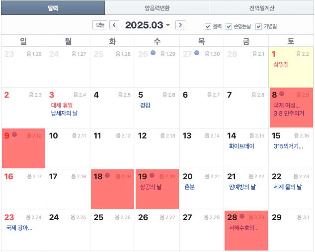 ✔ 2025년 3월 28일 금요일3월 손없는 날은 총 5일이 있습니다. 3월에 이사를 고려하고 계신 분들이 있다면, 손없는날 확인해보세요. 😉