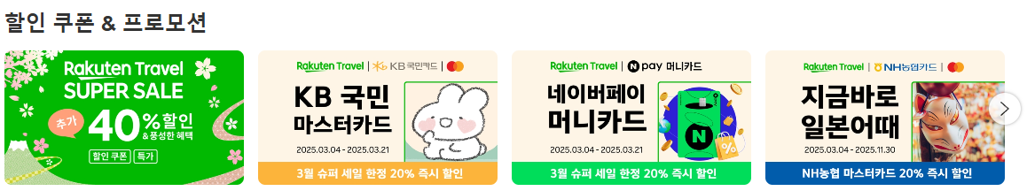 혜택 내용 기간 숙박 할인 료칸 포함 호텔 최대 57% 할인 2025년 3월 4일 ~ 3월 21일 렌터카 할인 최대 52% 할인 2025년 3월 10일 ~ 3월 18일 추가 할인 쿠폰 특정 카드 결제 시 20% 즉시 할인 쿠폰 제공 2025년 3월 4일 ~ 3월 21일 ✅ 카드 할인 쿠폰은 다른 쿠폰에 추가 적용이 가능하여 더 큰 할인 혜택을 경험할 수 있습니다!!