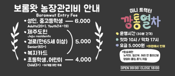 입장료는 성인&청소년 6,000원, 어린이 4,000원이며(24개월 미만은 무료), 제주 도민은 1,000원이 할인됩니다. 보롬왓은 개인 농장이므로 모든 관람객은 입장권을 구매해야 하며, 현장 결제와 네이버 예약, 카카오 예약 모두 지원합니다. 주말 방문 시 혼잡하니, 여유로운 관람을 원하신다면 평일 오전 방문을 추천드립니다.
